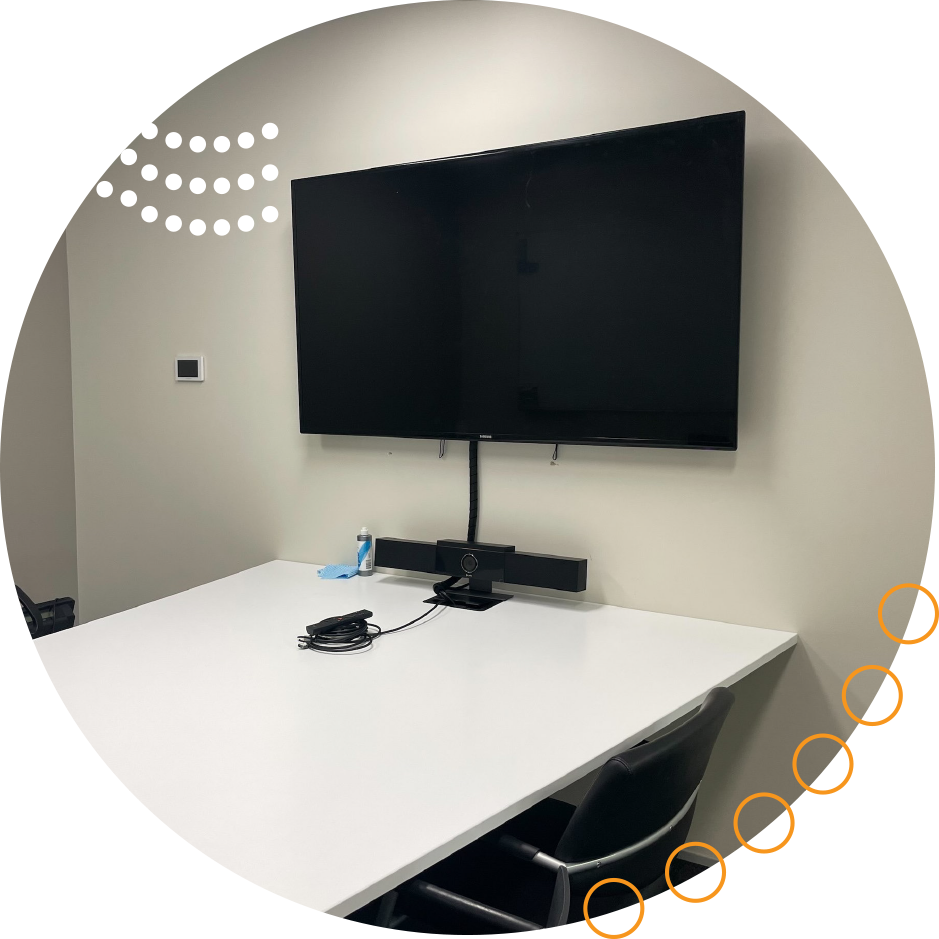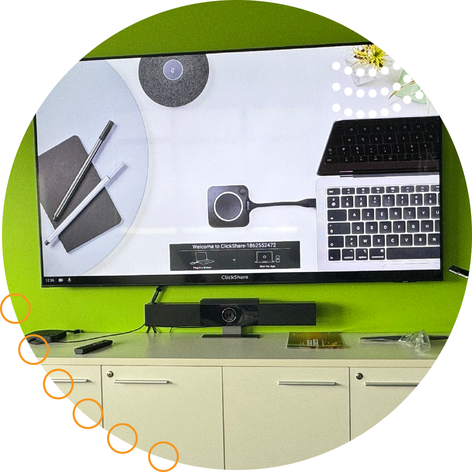 - Standardised HD displays (55”, 65”, or 75”) for clear visuals and presentations